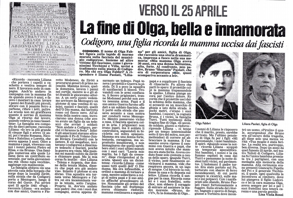 Verso il 25 aprile / La fine di Olga, bella e innamorata Codigoro, una figlia ricorda la mamma uccisa dai fascisti Intervista a Liliana Paolati (La Nuova Ferrara, 24 aprile 2007) Codigoro. Il nome di Olga Fabbri figura sulla lapide di marmo murata sulla facciata del municipio codigorese. Insieme ad altre vittime del fascismo, come i giovanissimi Ticchioni e Villa, uccisi a tradimento sulla piazza di Codigoro. Ma chi era Olga Fabbri? A rispondere è Iliana Paolati, “Liliana” per gli amici, figlia di Olga, che racconta una storia drammatica, impressa a fuoco nella sua memoria: « Mia mamma Olga aveva 30 anni, era una donna bellissima, alta, forte. Al confronto, mio padre, Bruno “Sbarazin” Paolati, che era di corporatura esile, quasi scompariva accanto a lei». [Continua…]
