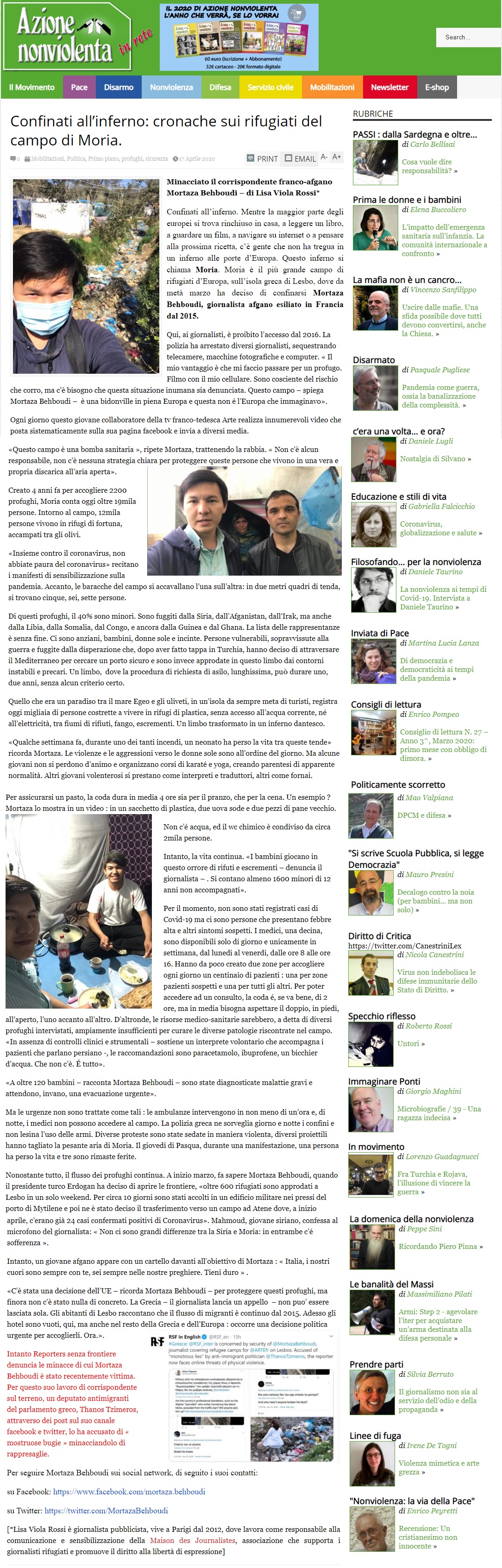 Intanto Reporters senza frontiere denuncia le minacce di cui Mortaza Behboudi è stato recentemente vittima. Per questo suo lavoro di corrispondente sul terreno, un deputato antimigranti del parlamento greco, Thanos Tzimeros, attraverso dei post sul suo canale facebook e twitter, lo ha accusato di « mostruose bugie » minacciandolo di rappresaglie.