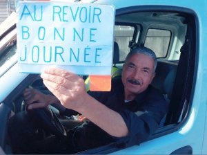 Quando il buongiorno si vede dall’agente della sicurezza municipale - #Bonjour #Paris n. 19-11/08/2018 Ieri mattina pedalavo allegramente lungo la strada che costeggia la Senna, quando all’improvviso un’auto della sicurezza municipale mi clacsona e dopo due secondi esatti una mano esce dal finestrino abbassato. Stringe un misterioso cartello. Rallento. Faccio manovra. Mi affaccio al finestrino. E vedo lui💘 P.S. Ci ha tenuto a farmi la traduzione del cartello anche in spagnolo